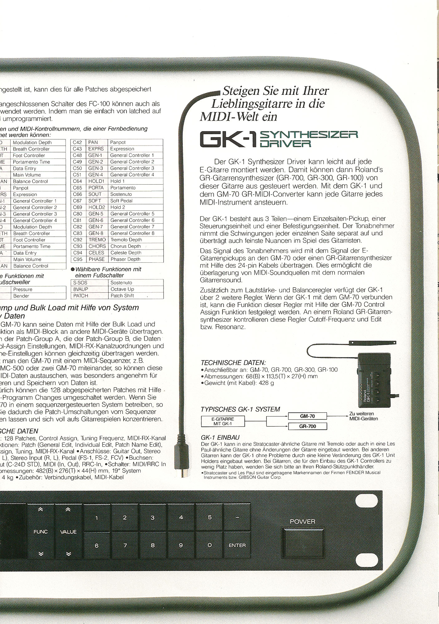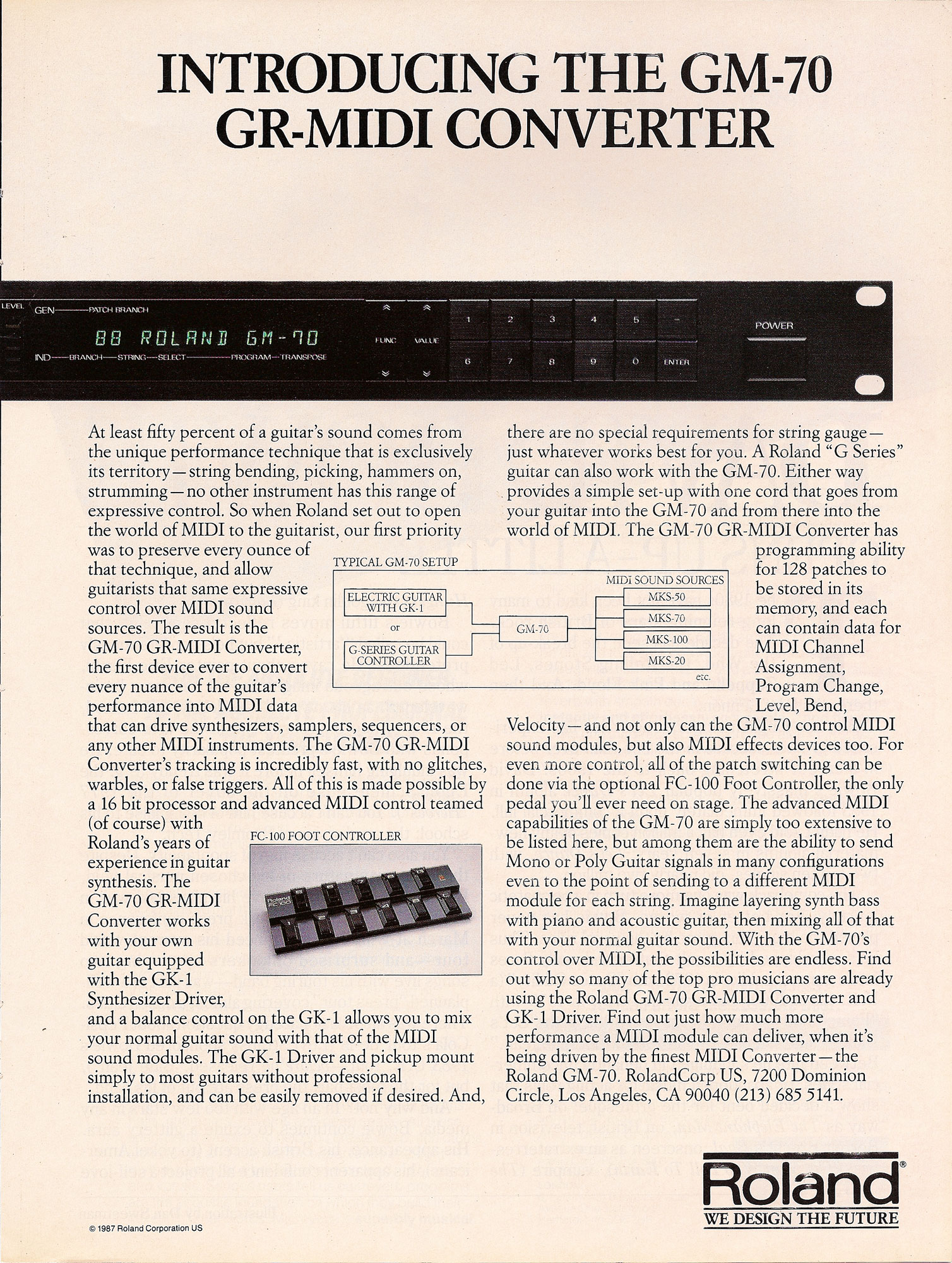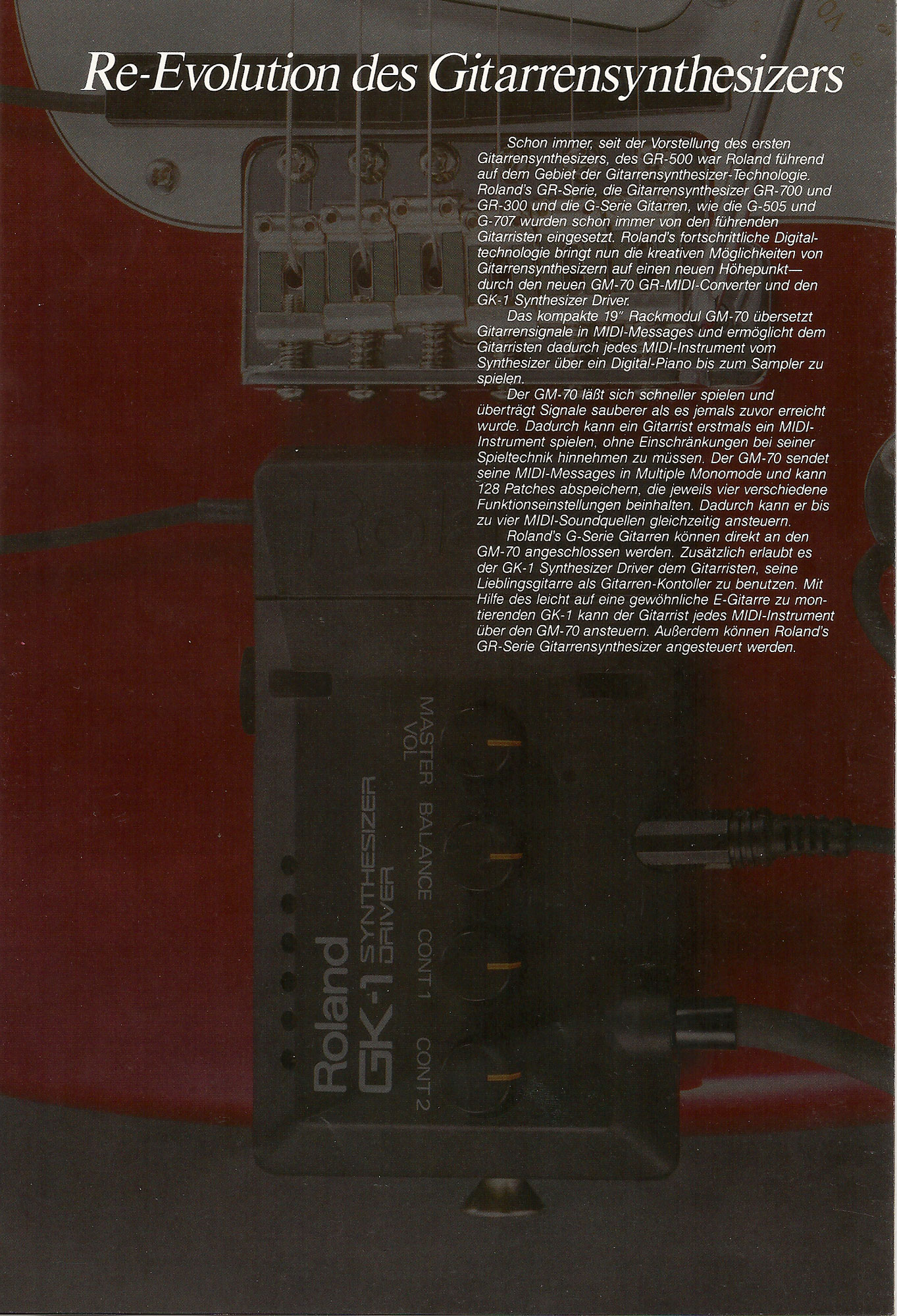 - Read The Full Review Roland shifts direction in 1987, releasing the Roland GK-1 and GM-70. This combo said goodbye to Roland guitars and dedicated guitar synthesizers like the GR-300 and G-808 in favor of a system that could be mounted on any guitar, and used to control any MIDI synthesizer. Read Warren Sirota's review of the GK-1, GM-70, and the MKS-50 and MKS-70.