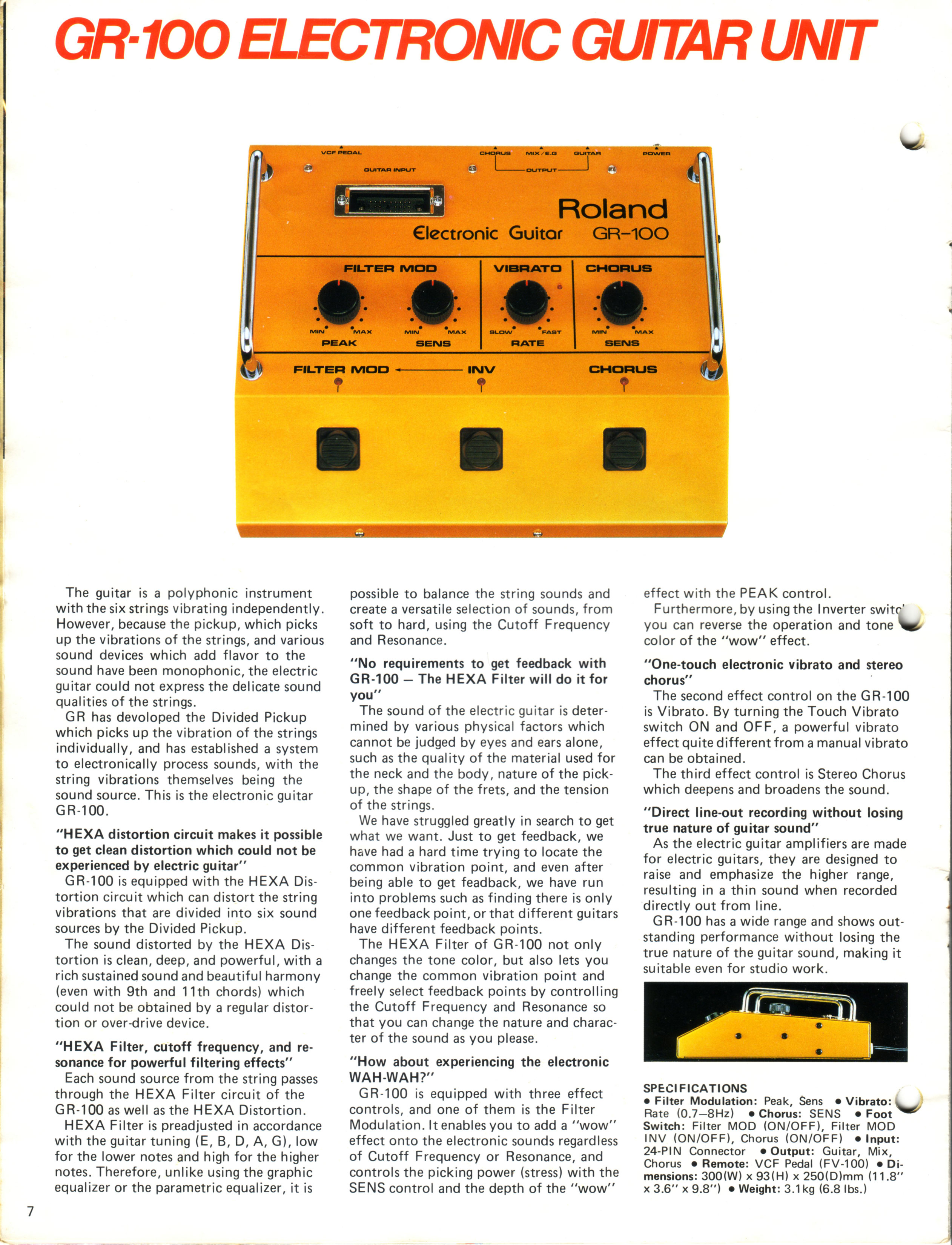 - Roland GR-100 Samples Sounds. The Roland GR-100 Owner's Manual has a list of "Factory Presets", Sample Sounds, at the end of the Owner's Manual. These sample sounds were intending to give some direction on how to use the GR-100, using features such as Filter Modulation, Chorus, and Vibrato, all served up with the classic hex fuzz sound the GR-100 is famous for. Check out this new YouTube video I posted which goes through the Sample Sounds to get a little flavor of what this vintage 'electronic guitar' synth sounded like!