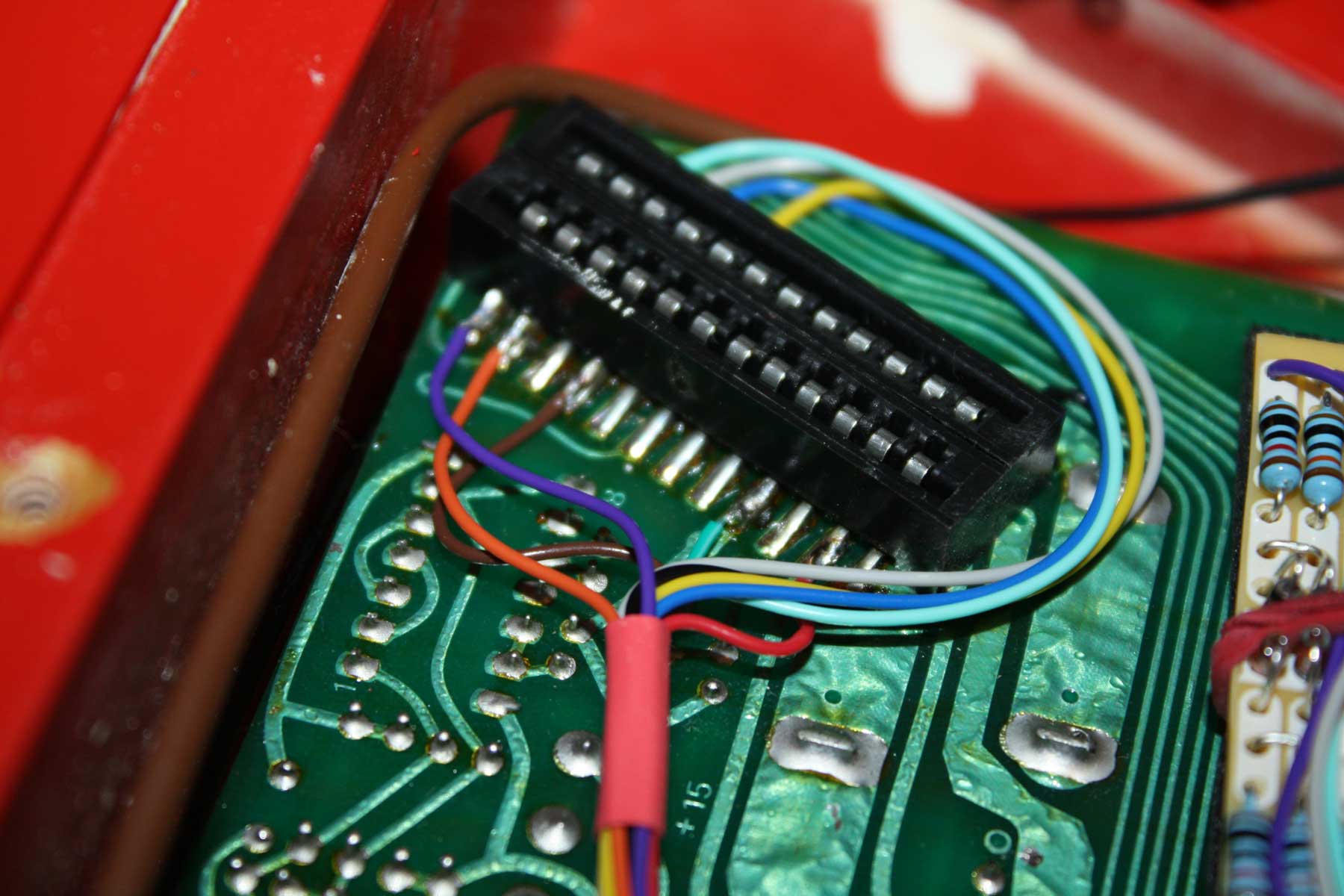 I installed this circuit on a small PC board sold by Radio Shack. I soldered input wires directly to the individual string outputs directly on the 24-pin connector.