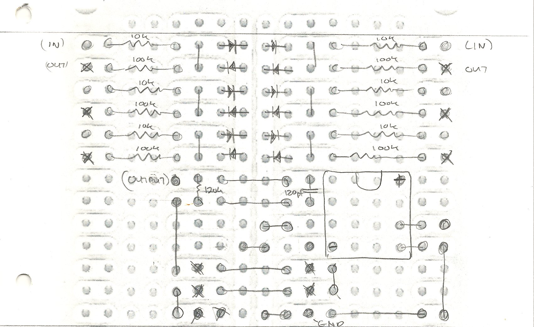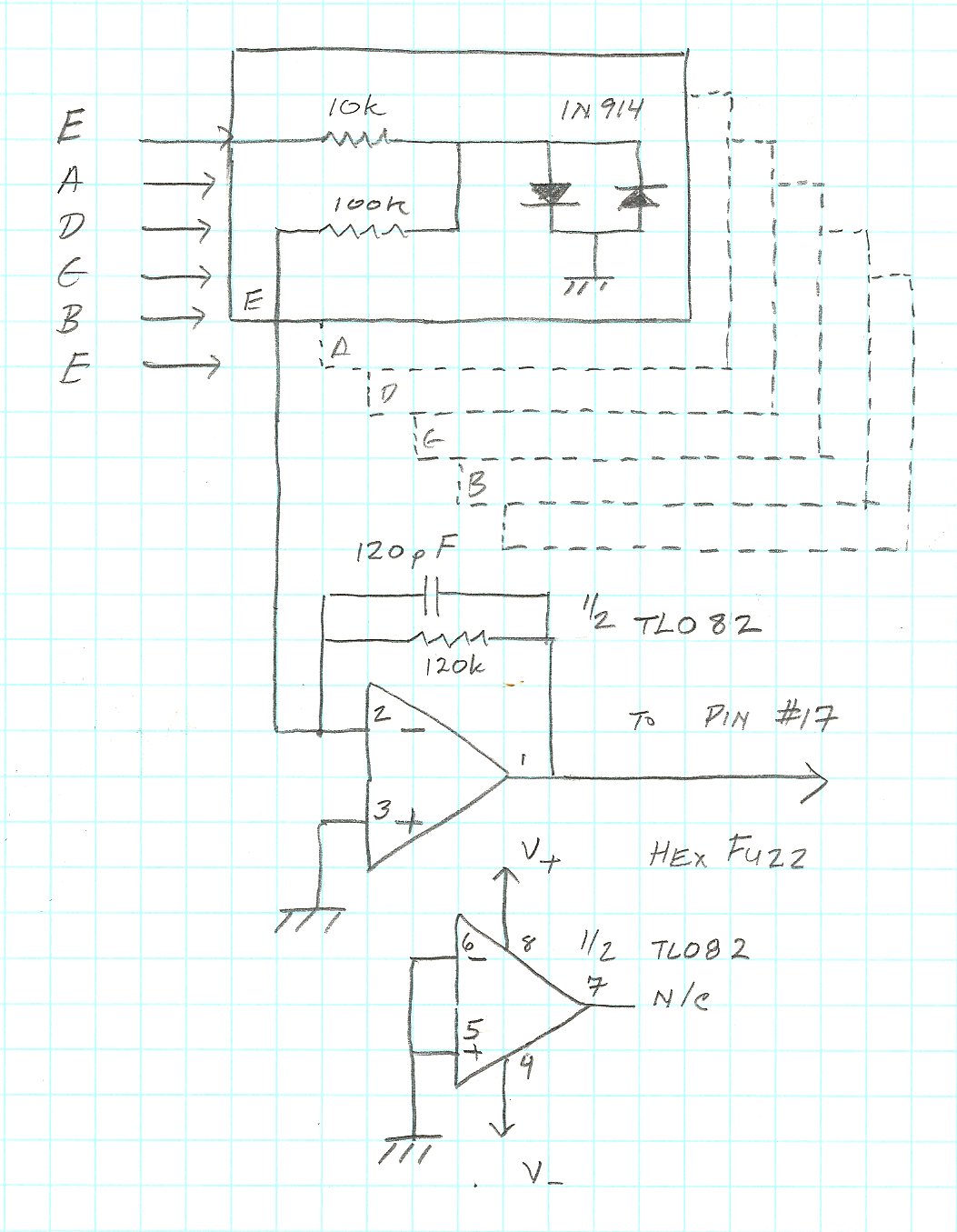After my most recent installation of this hex fuzz card on a Roland GR-700, I found I got the best results using BAT46 diodes and I increased the output resistor from 120K to 220K. The BAT46 diodes are a bit more expensive than the generic 1N914 diodes I used before, but they provide a much more satisfying level of distortion.